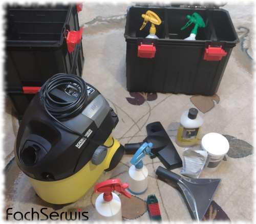 Posiadam kilka odkurzaczy piorących oraz pokaźny zestaw urządzeń i narzędzi ręcznych, które wspomagają pierwszy etap procesu prania ekstrakcyjnego, czyli perfekcyjne odkurzenie wstępne oraz prawidłowe i dogłębne rozprowadzenie preparatów chemicznych.