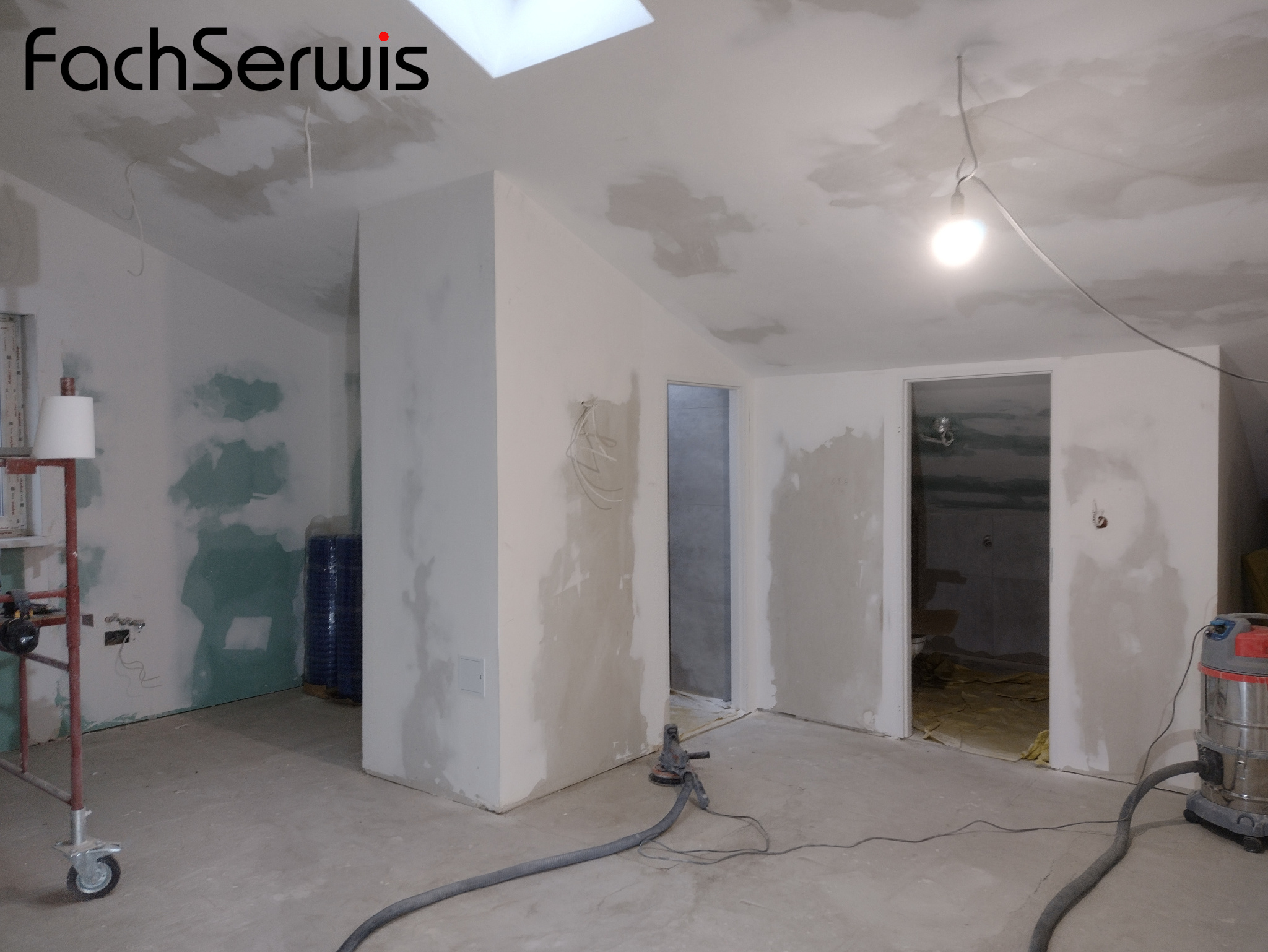 Na drugiej - ostatni szlif gładzi gipsowej, tuż przed malowaniem pomieszczenia.